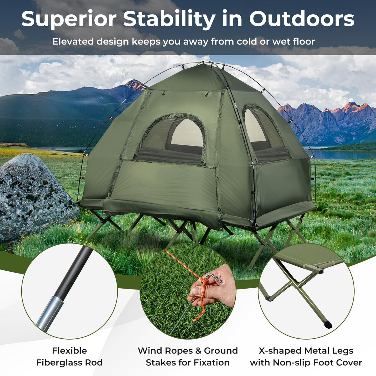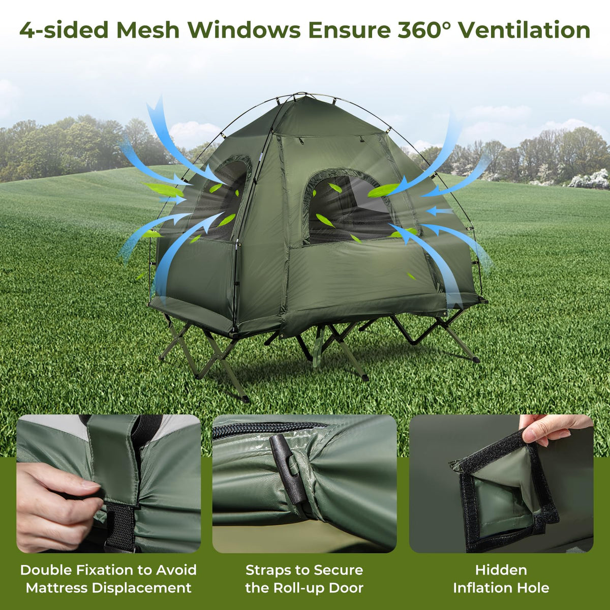 GYMAX Tent Cot, 5-in-1 Folding Camping Cot with Mattress & Pillows, Sleeping Bags, Sunshade