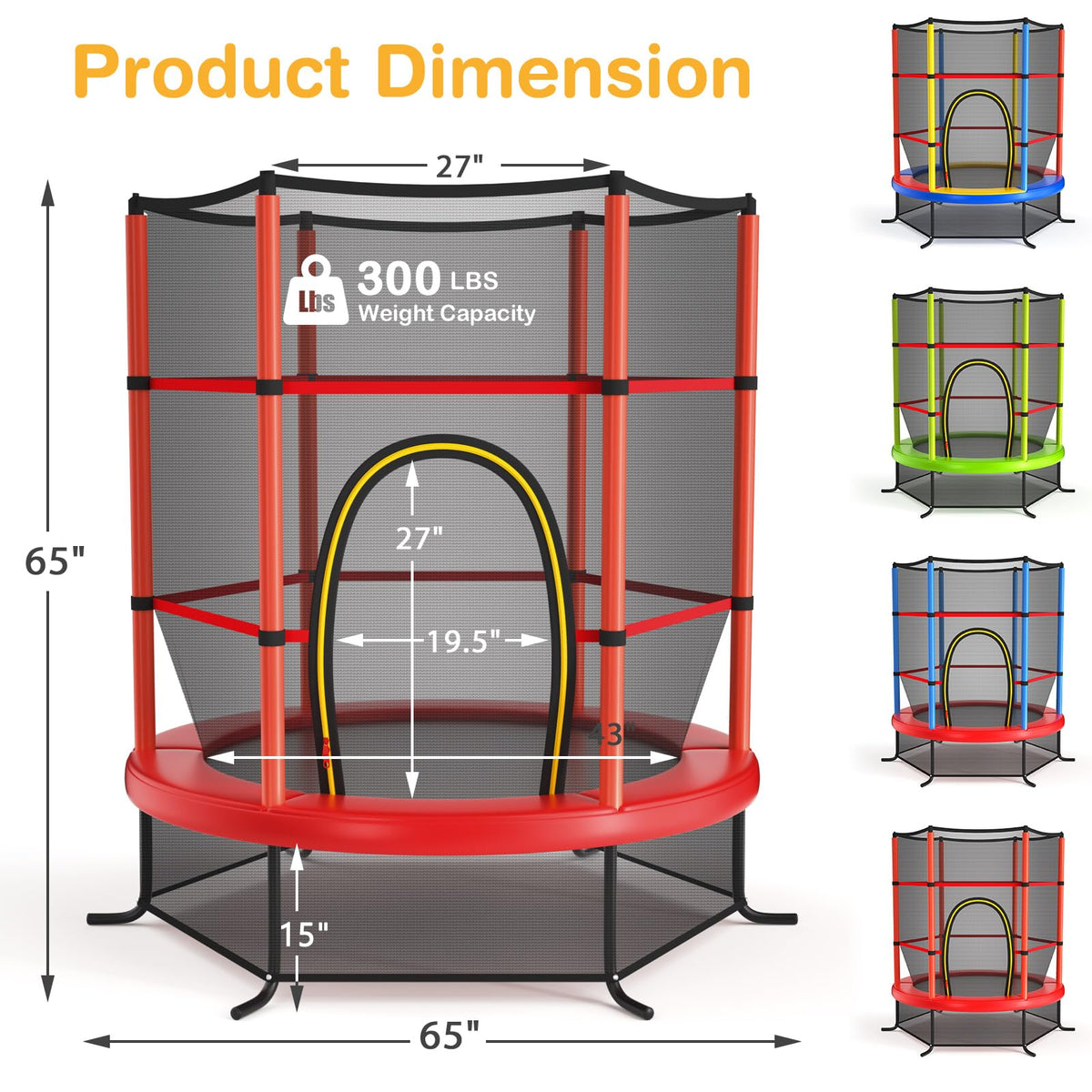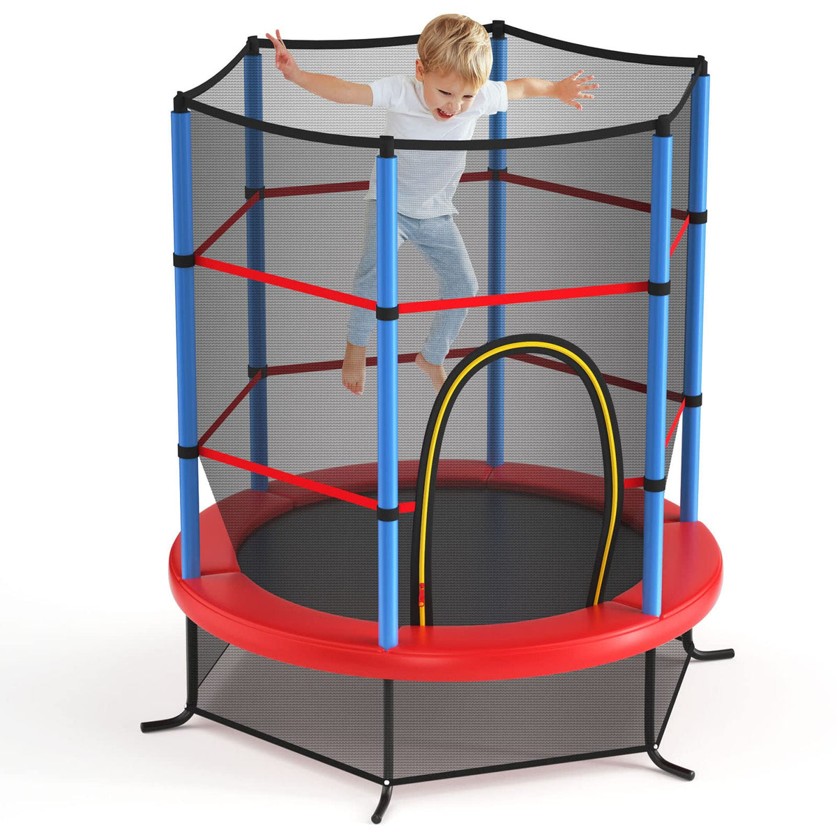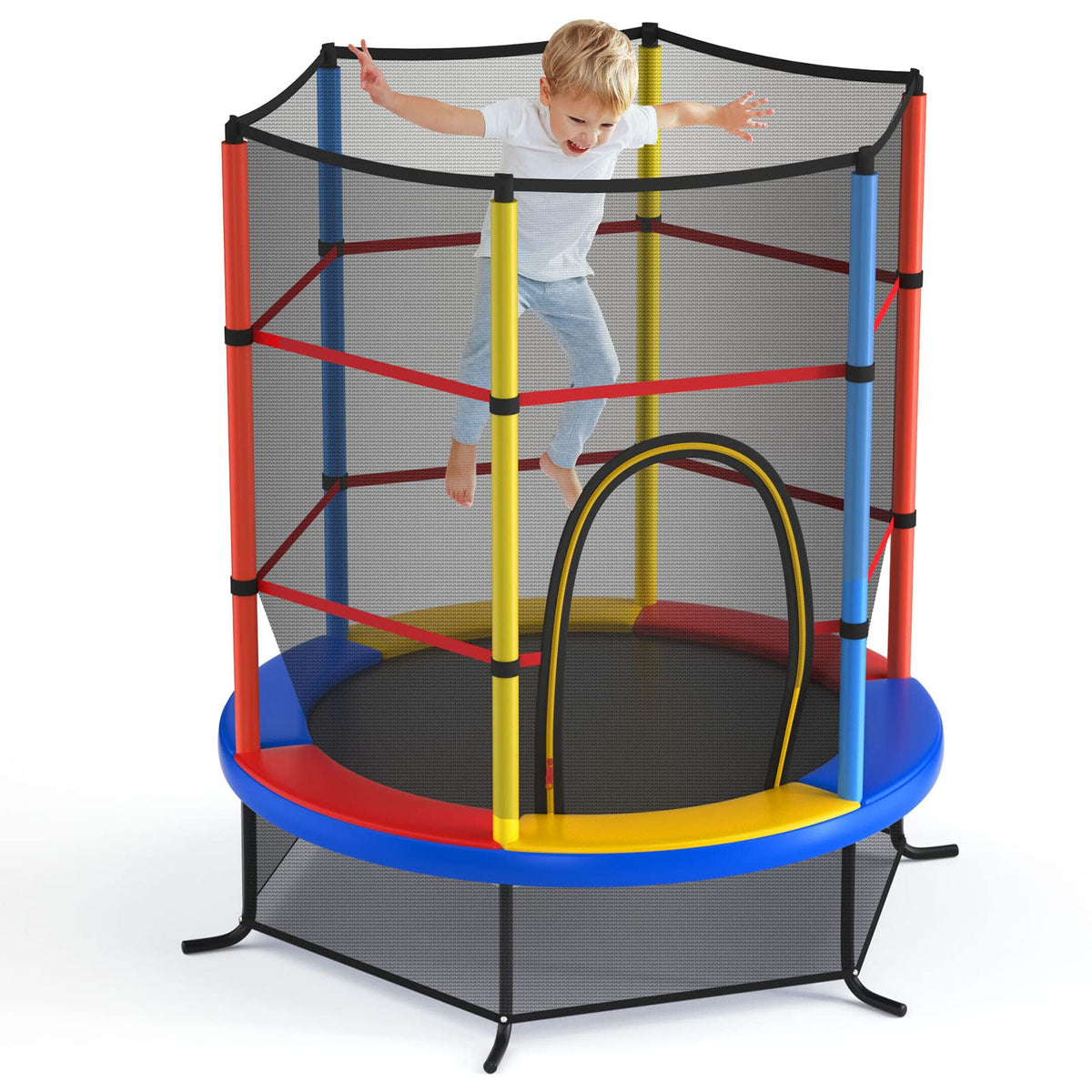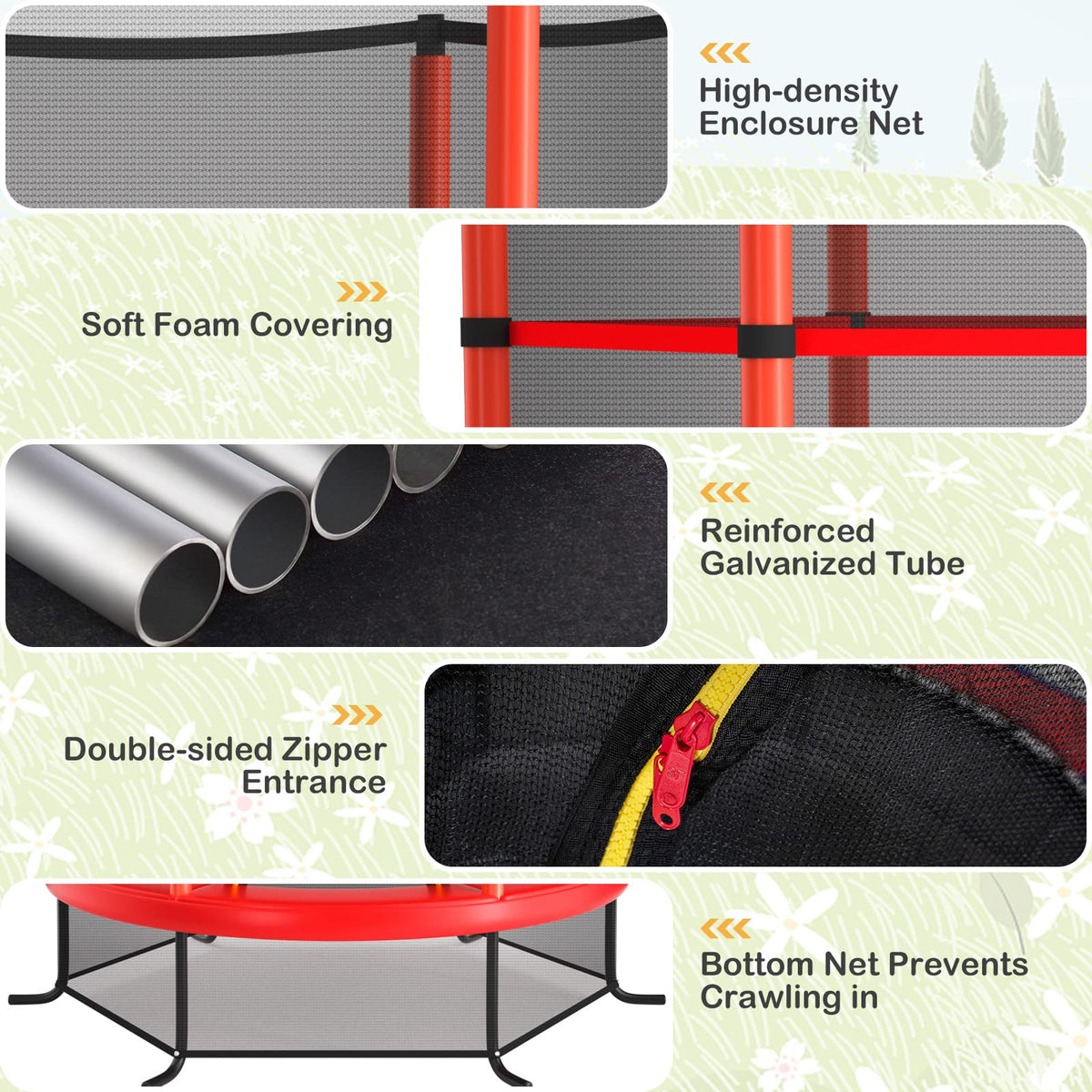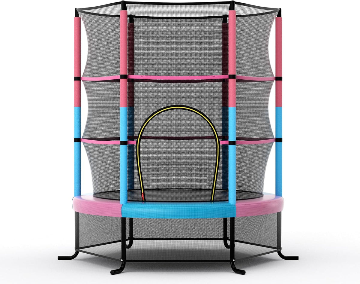 - All Round Enclosure Safety Net: The enclosure safety net of this toddler trampoline is installed inside, protecting kids from getting their hands or feet stuck. Its see-through design also allows you to keep an eye on them conveniently. The entrance provides easy access to trampoline and double-side zippers offer extra protection.