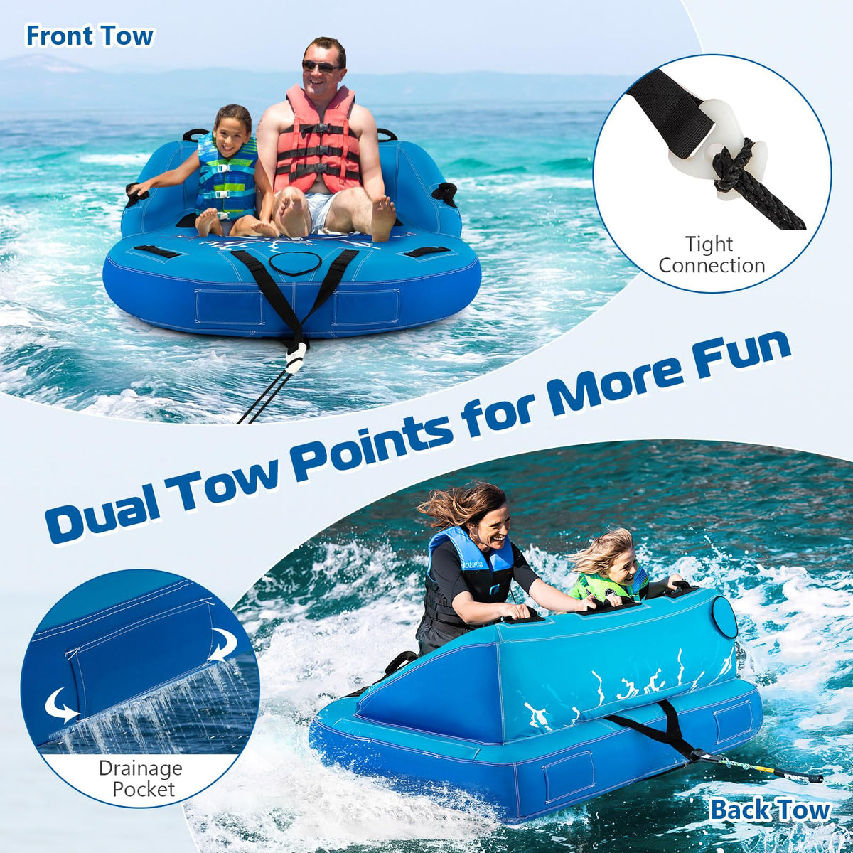 - Dual Towing Options: Experience different towing experience with dual tow points at front and back of the towables. Quick connector at front and the option to add a quick connect to the rear point offers more convenience.