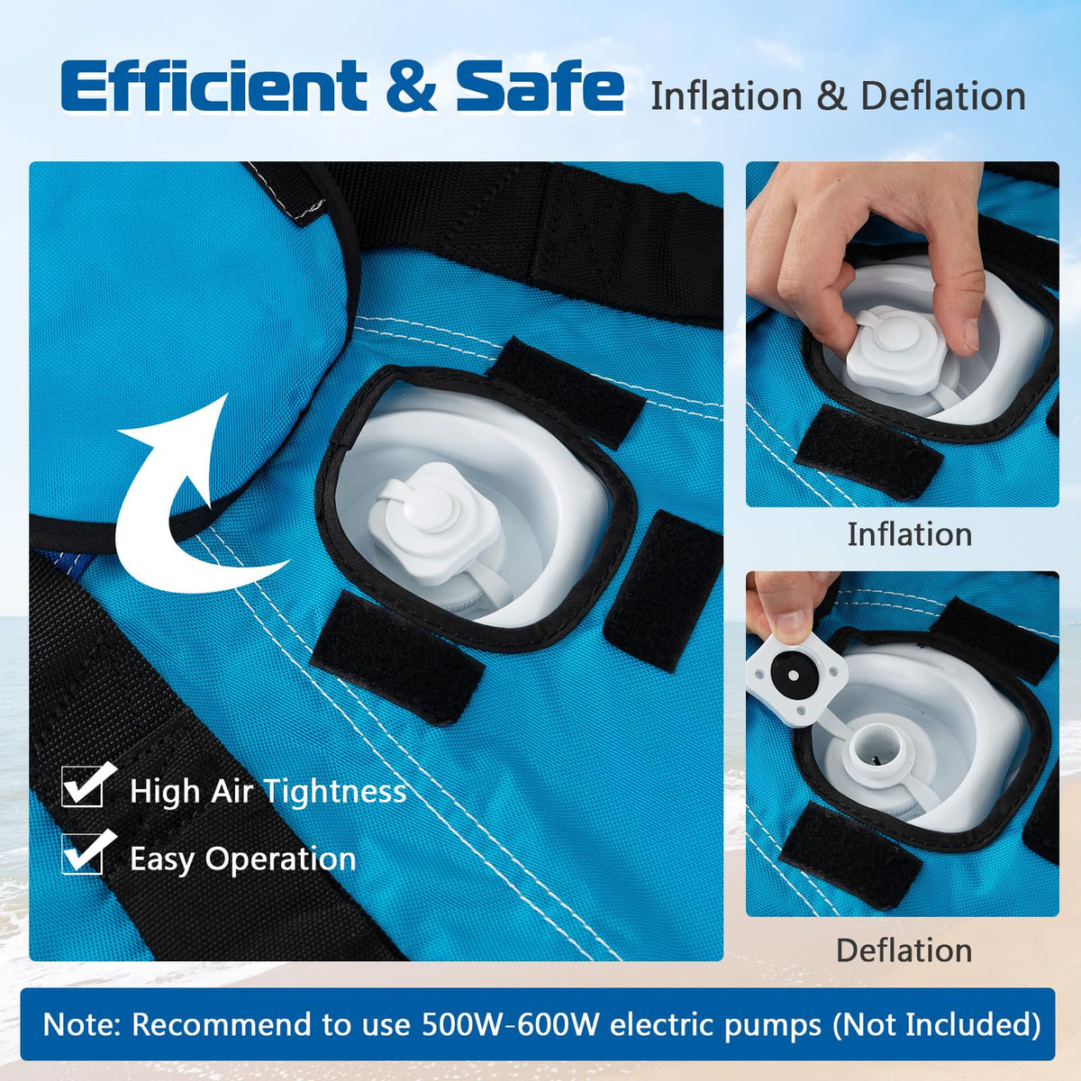 - Easy Inflation & Drainage System: Drainage pockets to flow out water and 2 independent air chambers ensure safe floating. Boston valves with cover is super easy to inflate and avoid leaking. (Pump NOT Included)