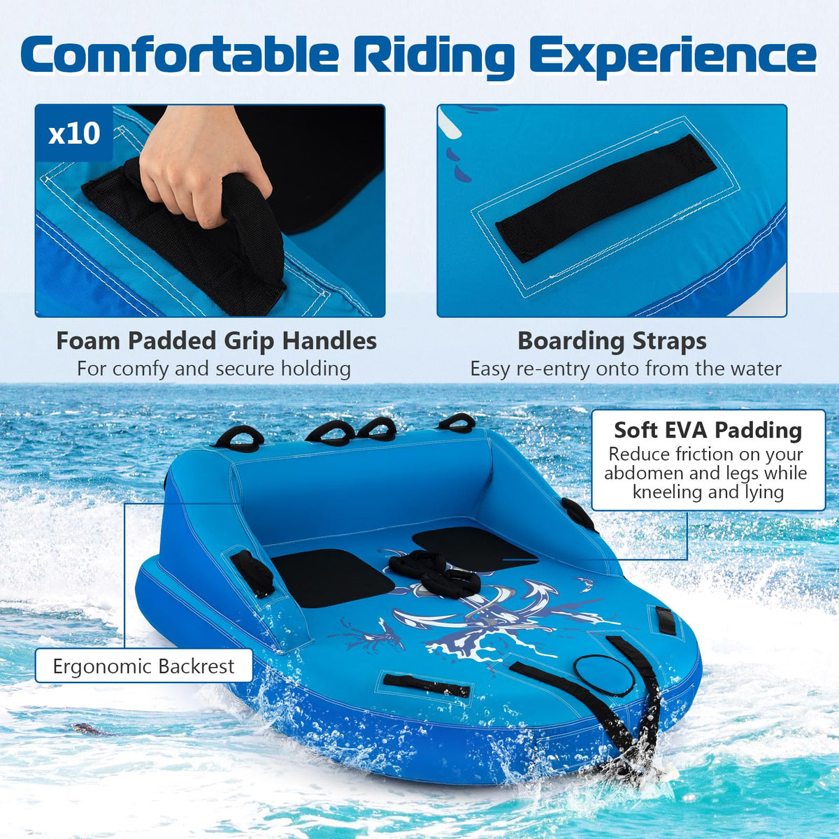 - Premium Riding Experience: Featuring 2 soft EVA seat pads and multiple easy grip handles, the boat tube provides ultra comfort during rides. Backrest and air-cushioned side wall offer sufficient support and allow you enjoy thrilling water sports in relaxing posture.
