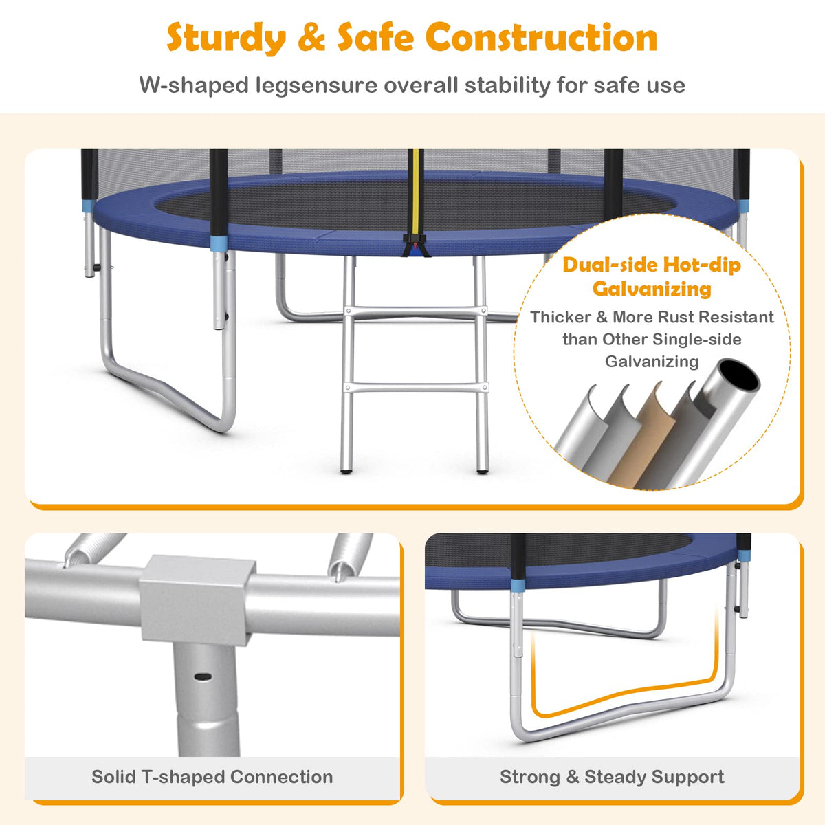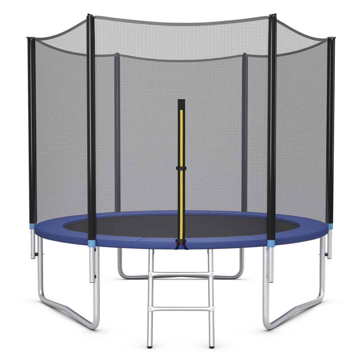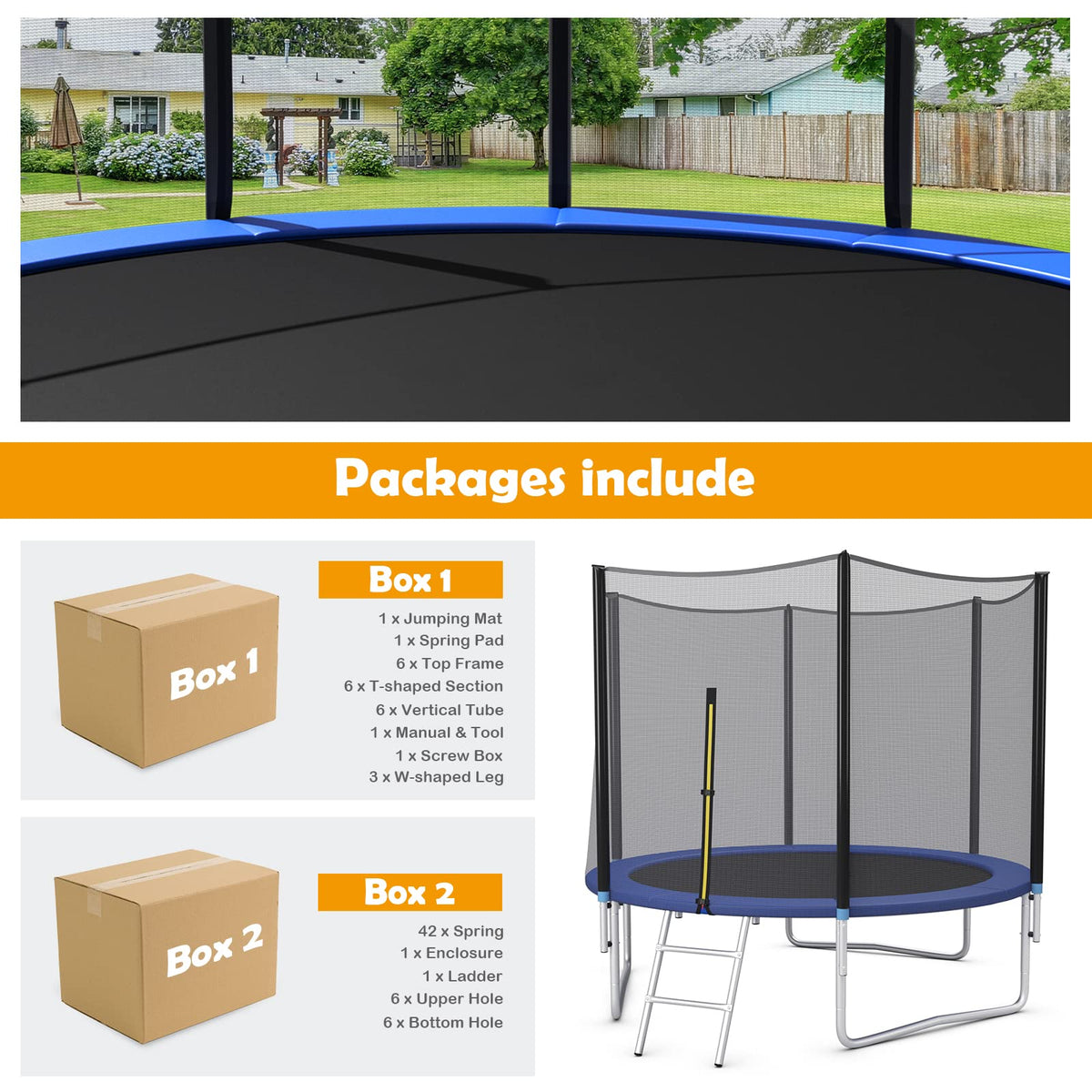 - Easy Installation & Convenient Use: With the installation manual included in the package, you can assemble the trampoline effortlessly. We provide you with six different options (8/ 10/ 12/ 14/ 15/ 16 FT with 42/ 54/ 72/ 80/ 90/ 108 PCS high-extension and rust resistant springs) for choice to satisfy various requirements. Besides, the ladder is equipped with a 2-step ladder for easy access to inner space.
