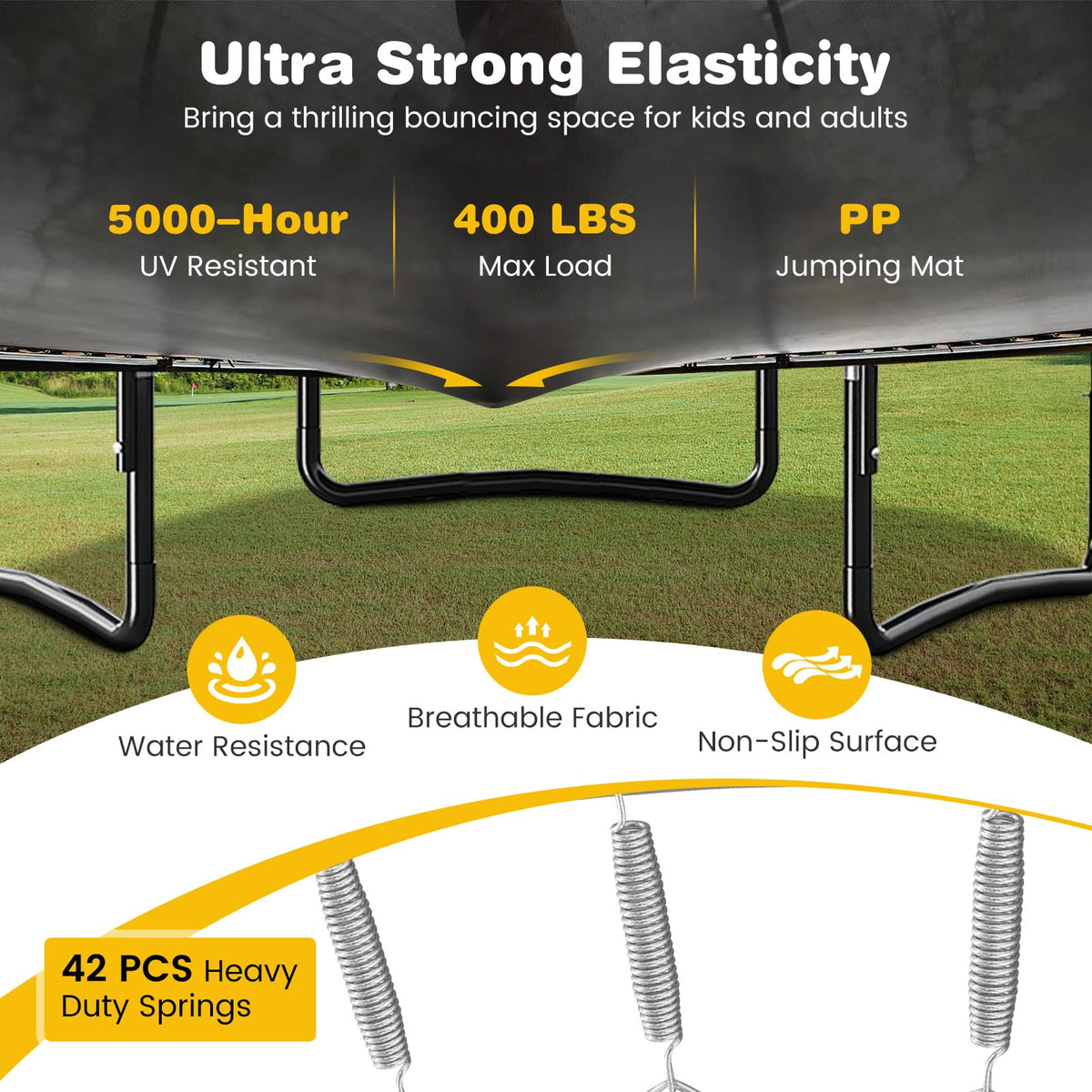 - Stable Bounce & Durability Tests: The premium PP jumping mat made of breathable fabric features great water resistance and a non-slip surface, and it has tested up to 5000 hrs for reliable UV resistance. Strong galvanized springs (8 ft-42 pcs, 10 ft-56 pcs, 12 ft-72 pcs) provide superior rebounding force.