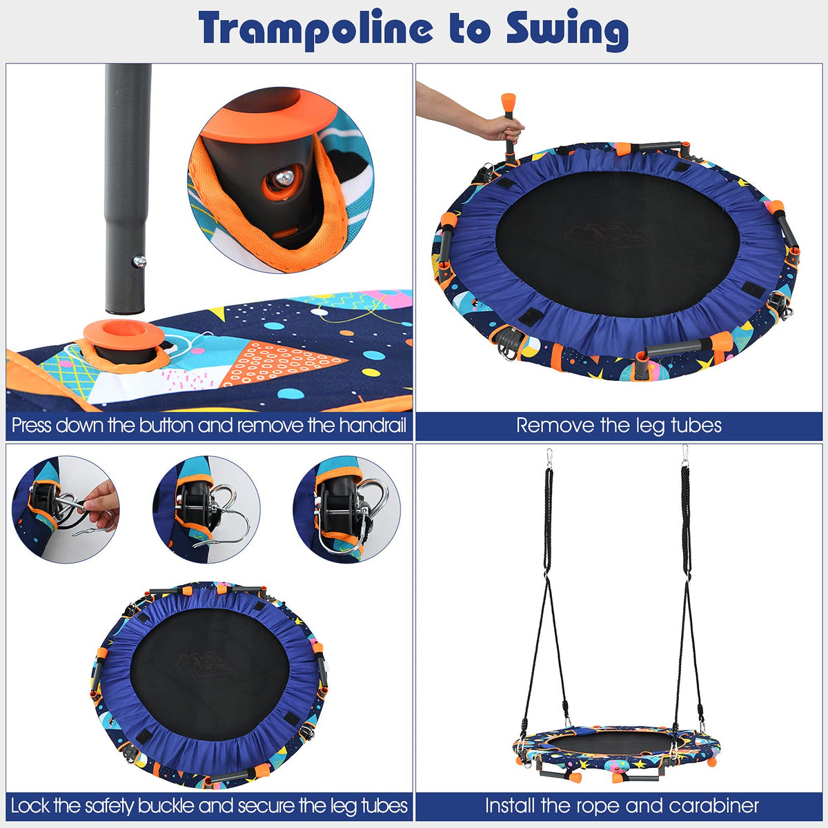 - 2 in 1 Combo: Unique combination of swing and trampoline offers kids double joy. Simply removing the handrail, securing legs and add rope on the pad, you can convert the trampoline to a tree swing.