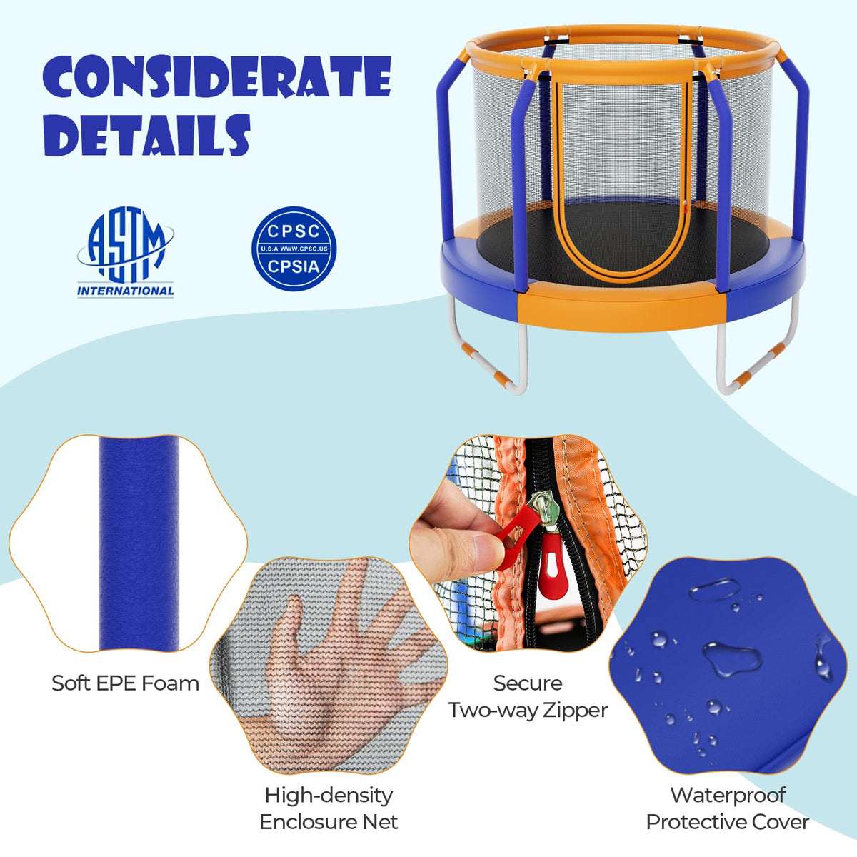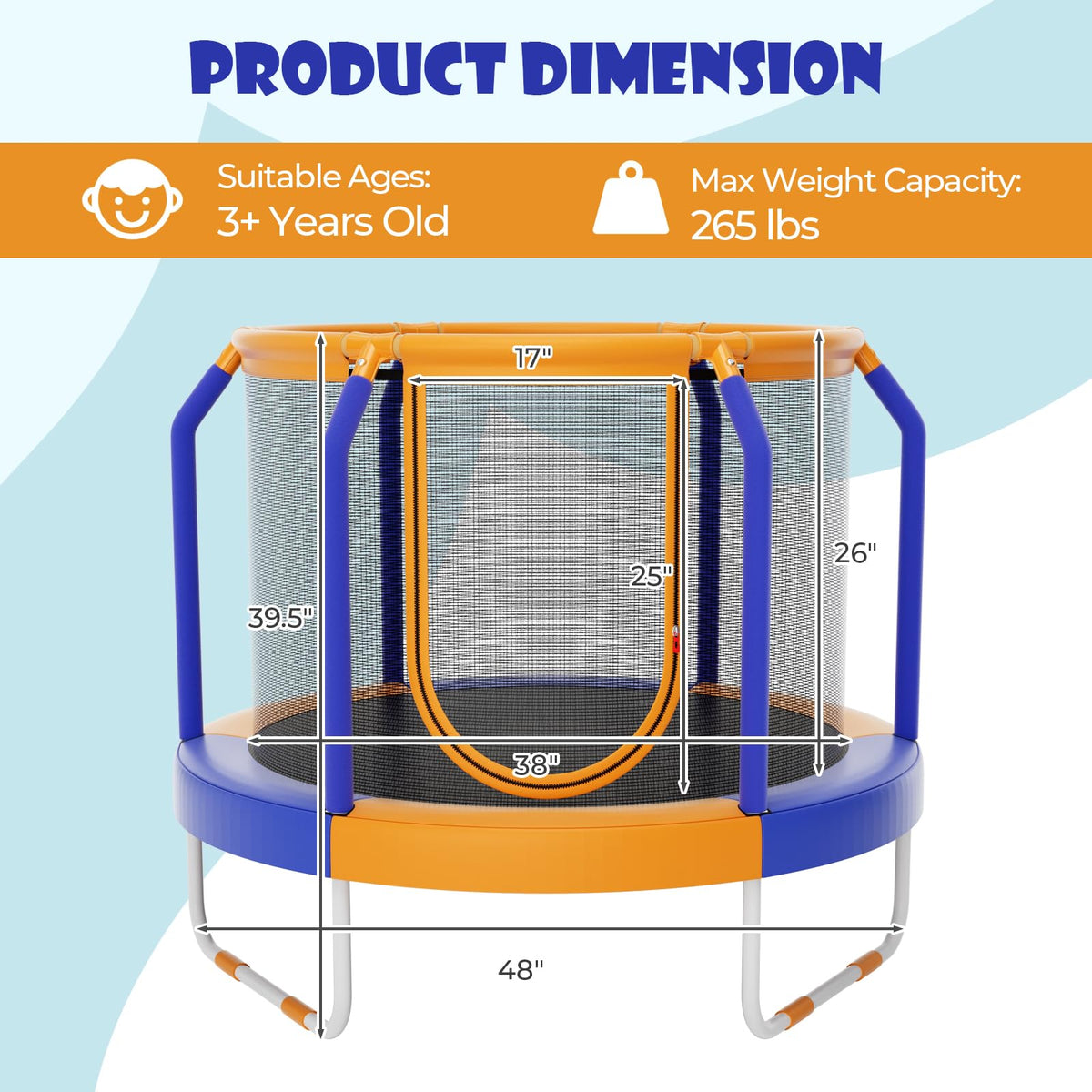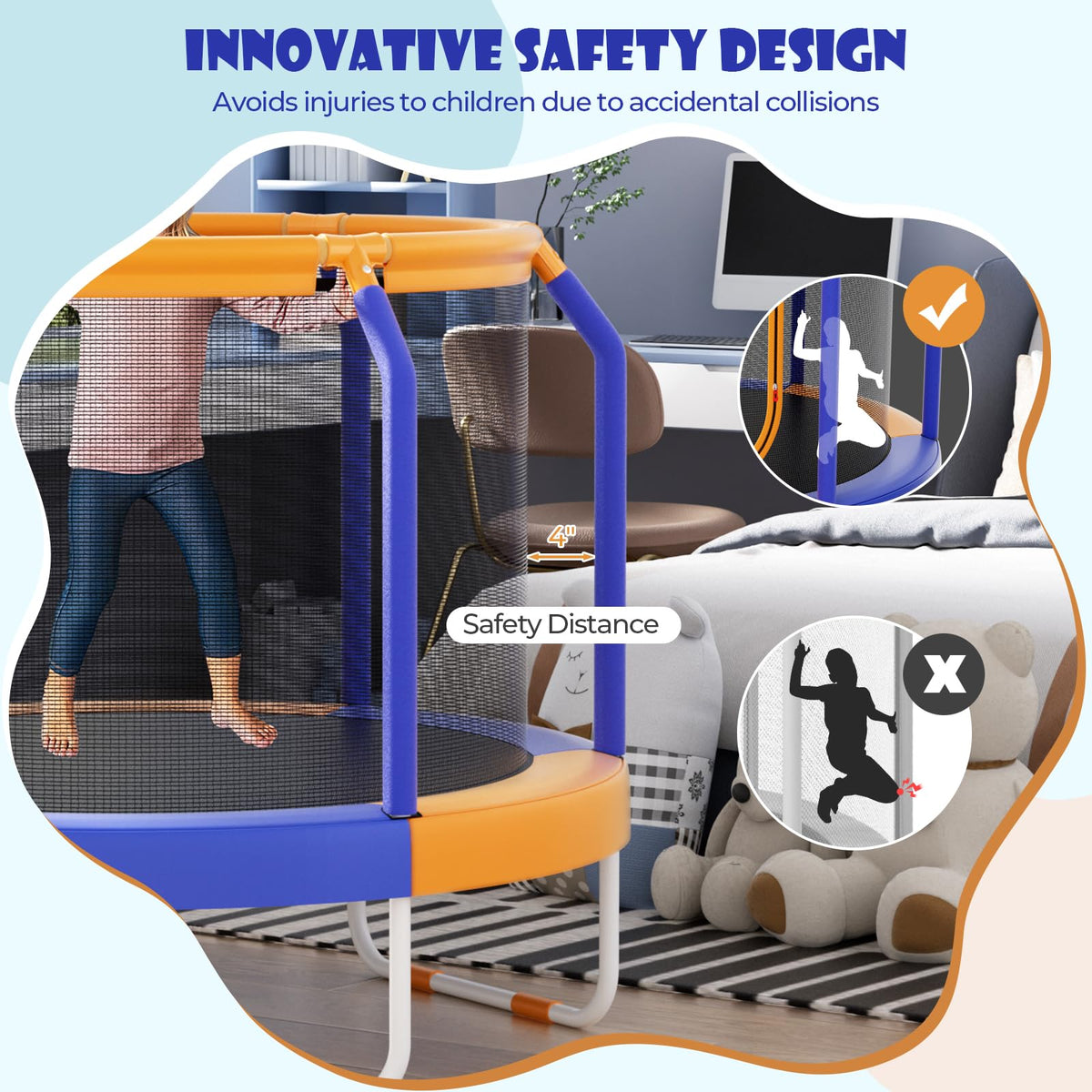 - Safety Comes First: With a safety distance between the net and poles, GYMAX kids trampoline leaves you no worries about injuries of accidental collisions. Meanwhile, the seamless design protects the child from getting stuck for enhanced security. Furthermore, chose elastic bungees rather than harsh springs, this small trampoline is more secure for toddlers.