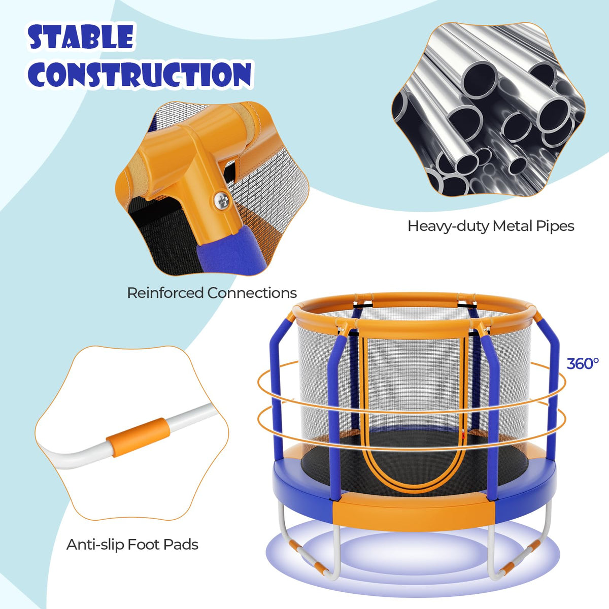 - Stable Construction: This toddler trampoline features 3 U-shaped metal legs with anti-slip pads, which ensure overall stability. Moreover, the built-in handrail enable kids to stand on their own and jump more safely.