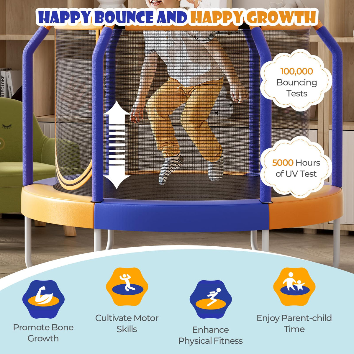 - Enjoy Bouncing & Fun: With wear-resistant and breathable PP jumping mat, this kids trampoline would be a perfect energy burner for your little one. Passed 100,000 bouncing tests and 5000 hours of UV test, GYMAX recreational trampoline offers you long time accompany.