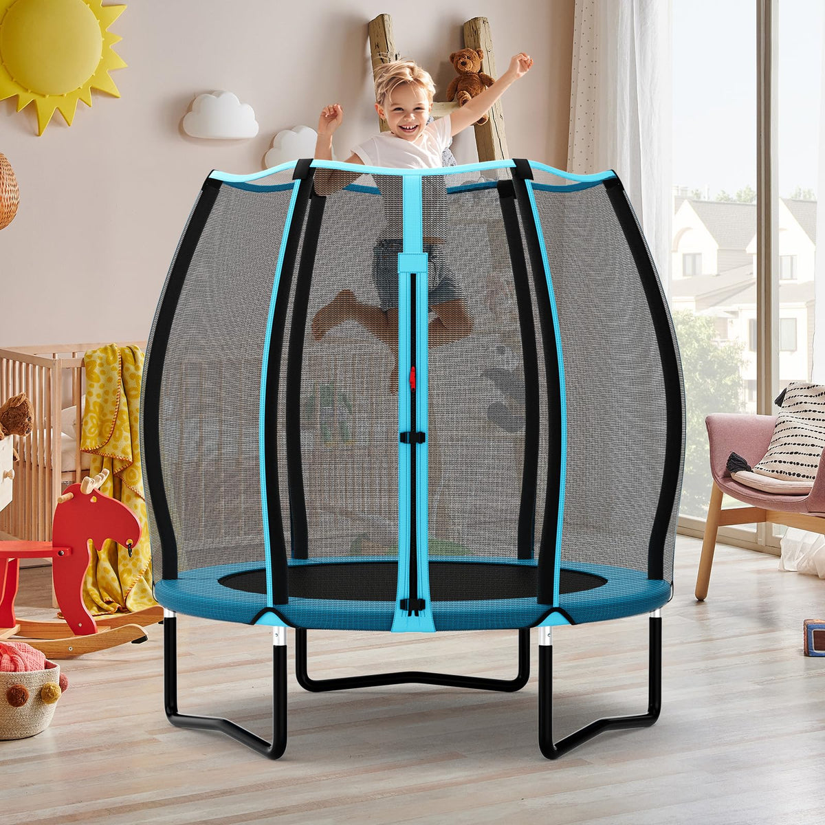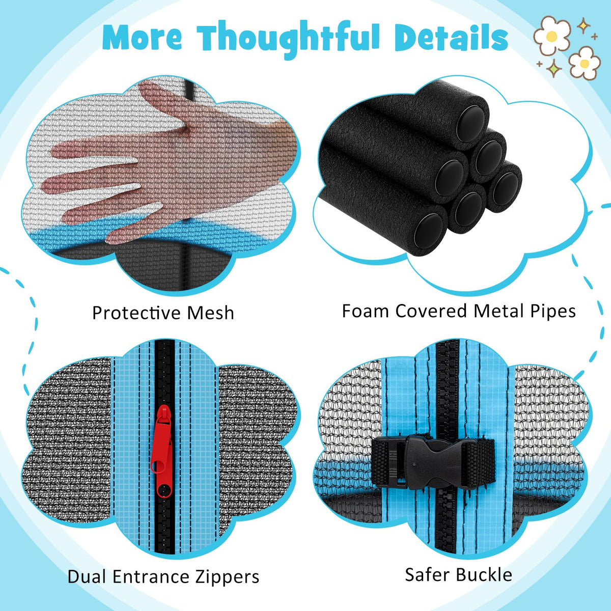 - Parents Helper: Featuring a 360 degree transparent net, this toddler trampoline allows you to have your own time while babysitting kids all the time. Meanwhile, double-side zipper and safety buckle make this indoor trampoline easy to access.