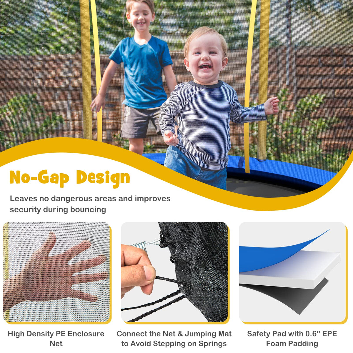 - Safety Comes First: No-gap design leaves no dangerous areas and improves security during bouncing. The high density PE enclosure net and safety pad with 0.6" EPE foam padding provide 360 degree safety protection. Foam cover on the trampoline poles and safety distance between net and poles reduce injury of hitting on poles when jumping.