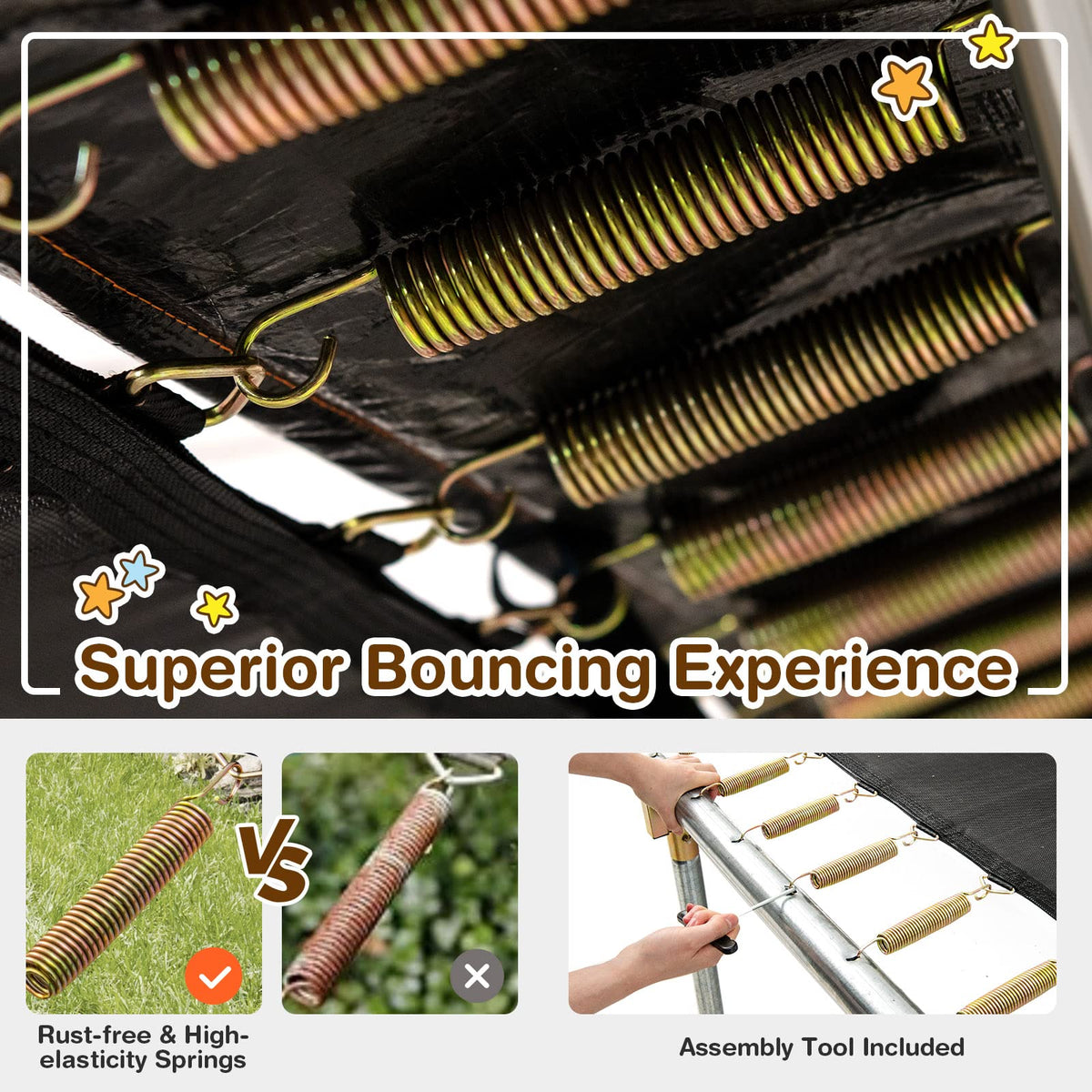 - Awesome Bouncing Experience: The kids trampoline features a 12ft x 6ft high-elastic jumping mat, providing an awesome bouncing experience for both kids and adults. And the mat is evenly stretched by 84 pcs bold strong springs, which is rather resilient and durable than ordinary types of springs.