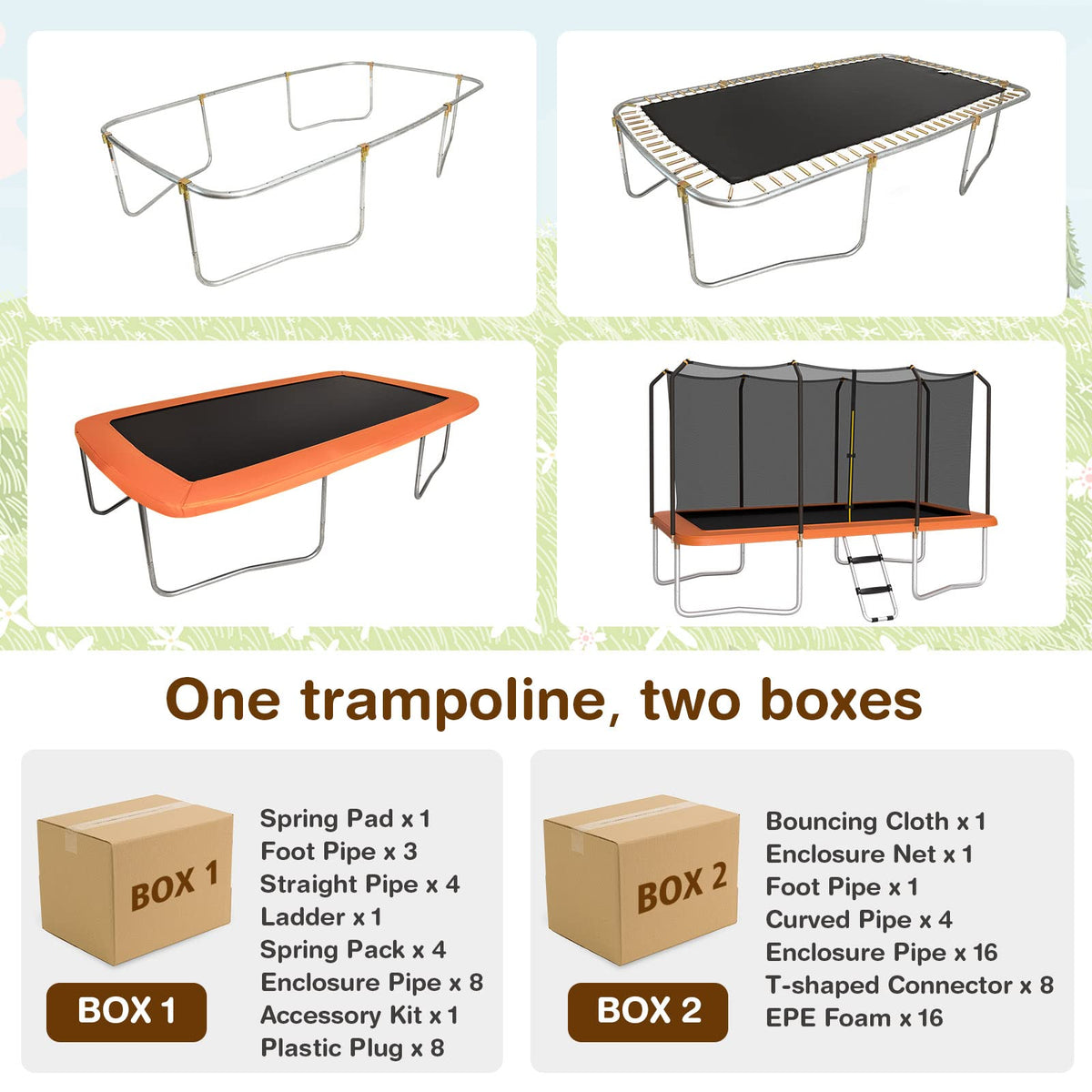 - Easy to Set up: The outdoor trampoline is packed in 2 boxes that may arrive separately, so please be patient to wait for your package. And the package includes necessary assemble tools, such as T hook, which helps you install the high-tension springs with ease.