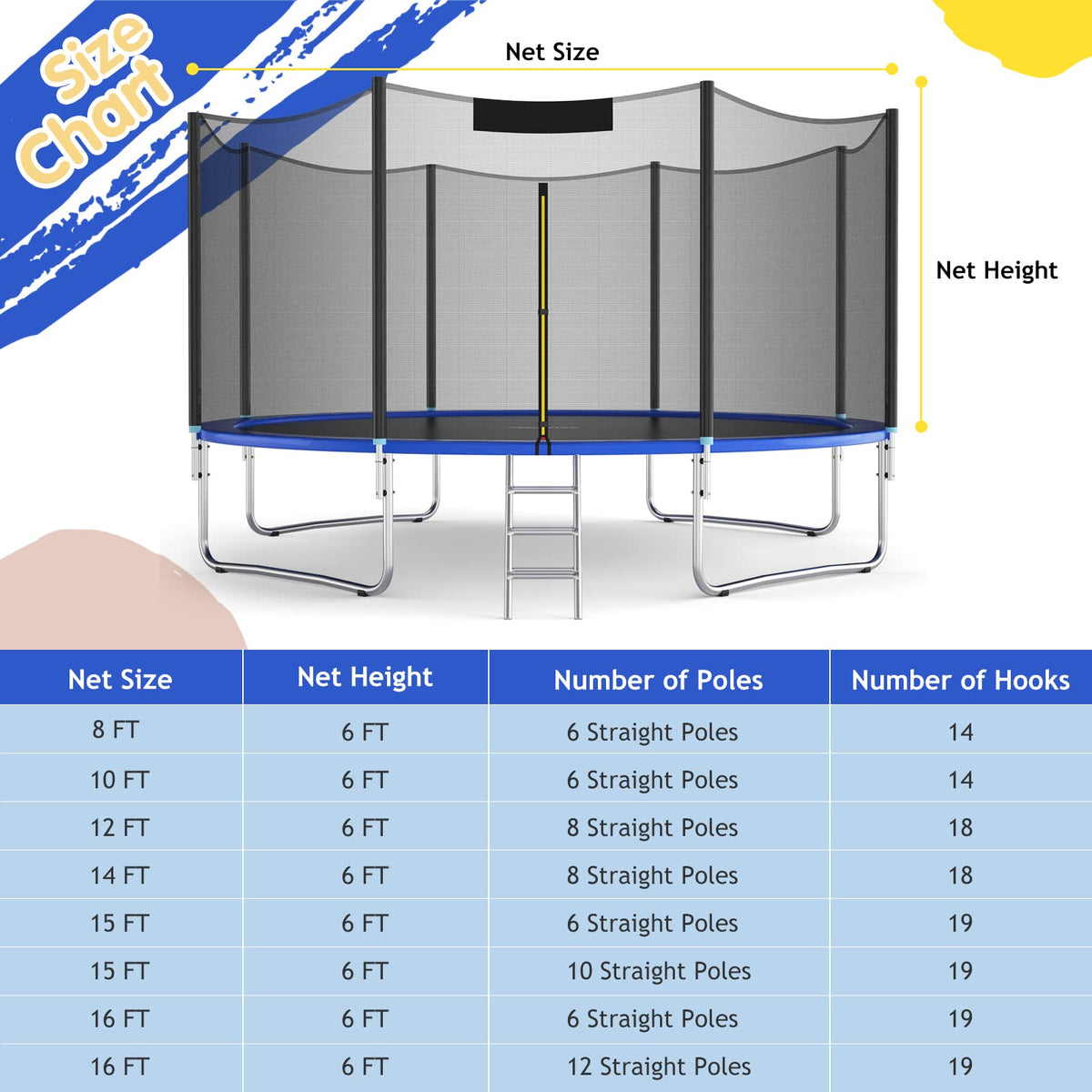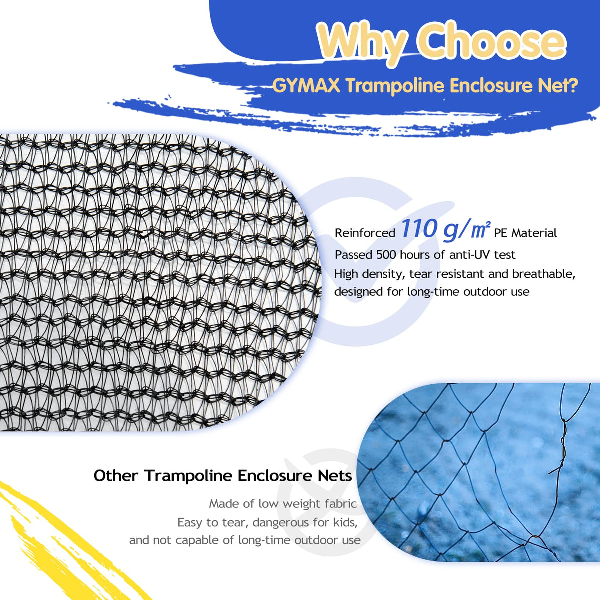 - Comprehensive Size Options: GYMAX offer various size options for trampoline enclosure replacement, including safety net for 8 10 12 14 15 16Ft trampoline of both inside and outside net.