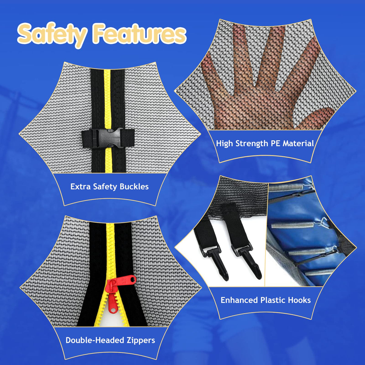 - Easy Access with Safety: Featuring a double-side zipper, this trampoline can be close or open from both outside and inside. The protective buckle avoids the risk of zipping by accident.