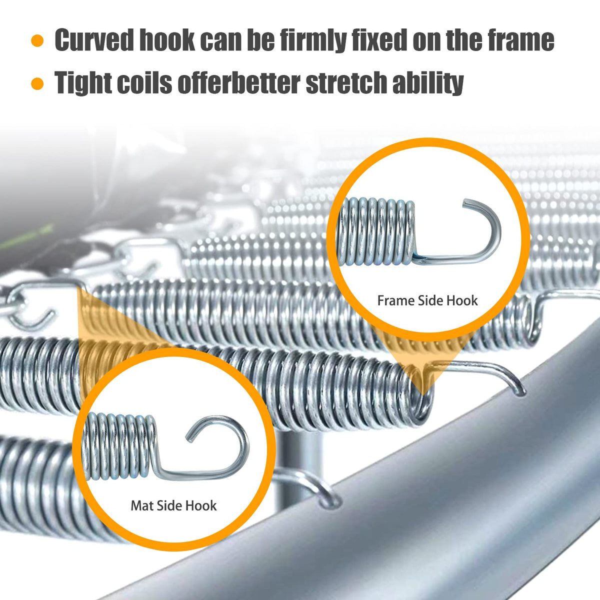 - Curved Ends for Great Safety: The trampoline spring is designed with slightly curved hooks on both ends. Therefore, the spring can be firmly fixed on your trampoline to reduce the possibility of falling apart, which greatly increases security during bouncing.