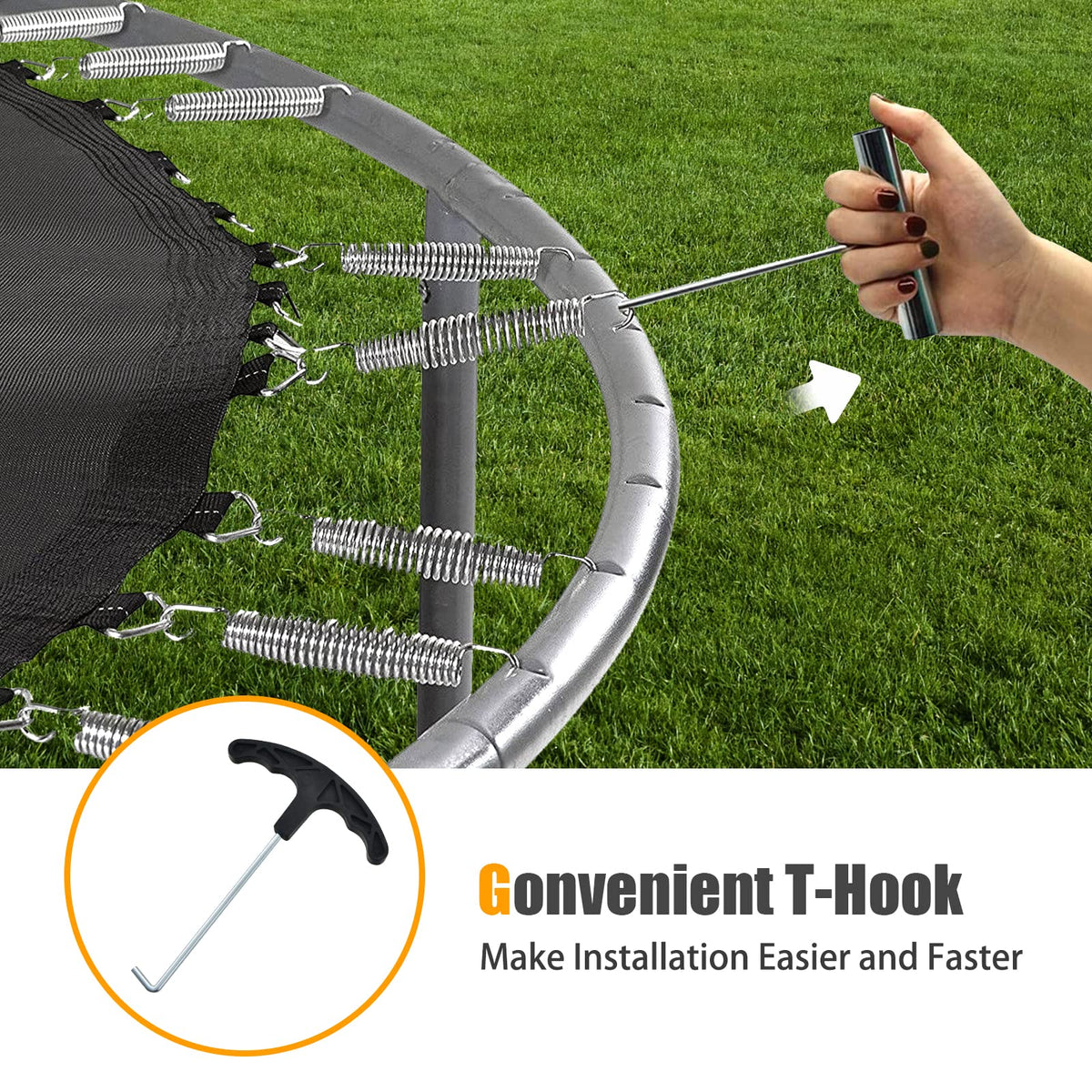 - Easy to Replace with T-Hook: Considering your convenience, our trampoline springs come with a T-hook tool. You can use it to pull the spring and hook to the trampoline frame with ease, saving you a lot of labor and time. Besides, the finger grooves on the handle make the T-hook easy to grip.