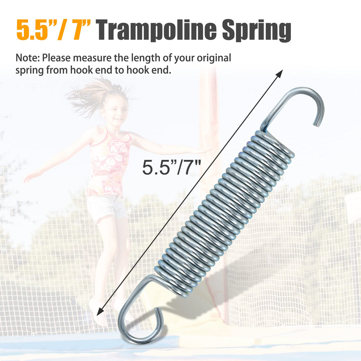 - Product Dimension: Our trampoline springs are available in two sizes, 5.5 inches and 7 inches length. Before purchasing, you'd better measure the length of your original spring from hook end to hook end.