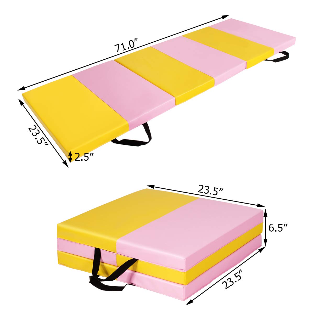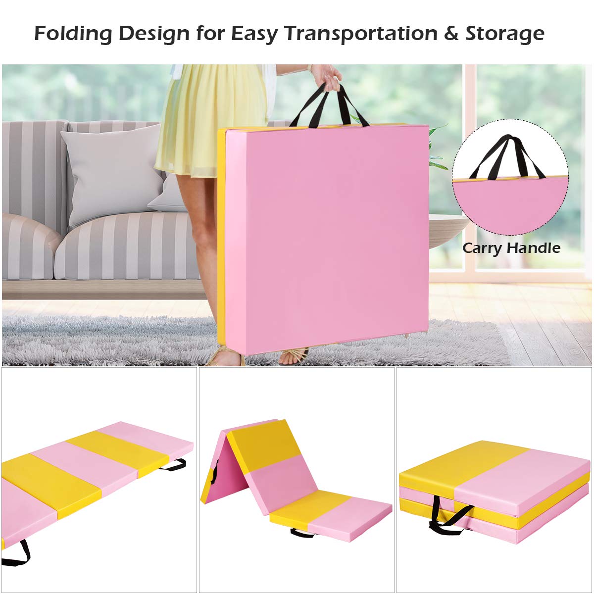 - Space-saving and Portable: Its Tri-fold design save a lot of spaces, and two carrying handles make transportation convenient. It can be stored into closets, car trunks, or in storage units at the gym.