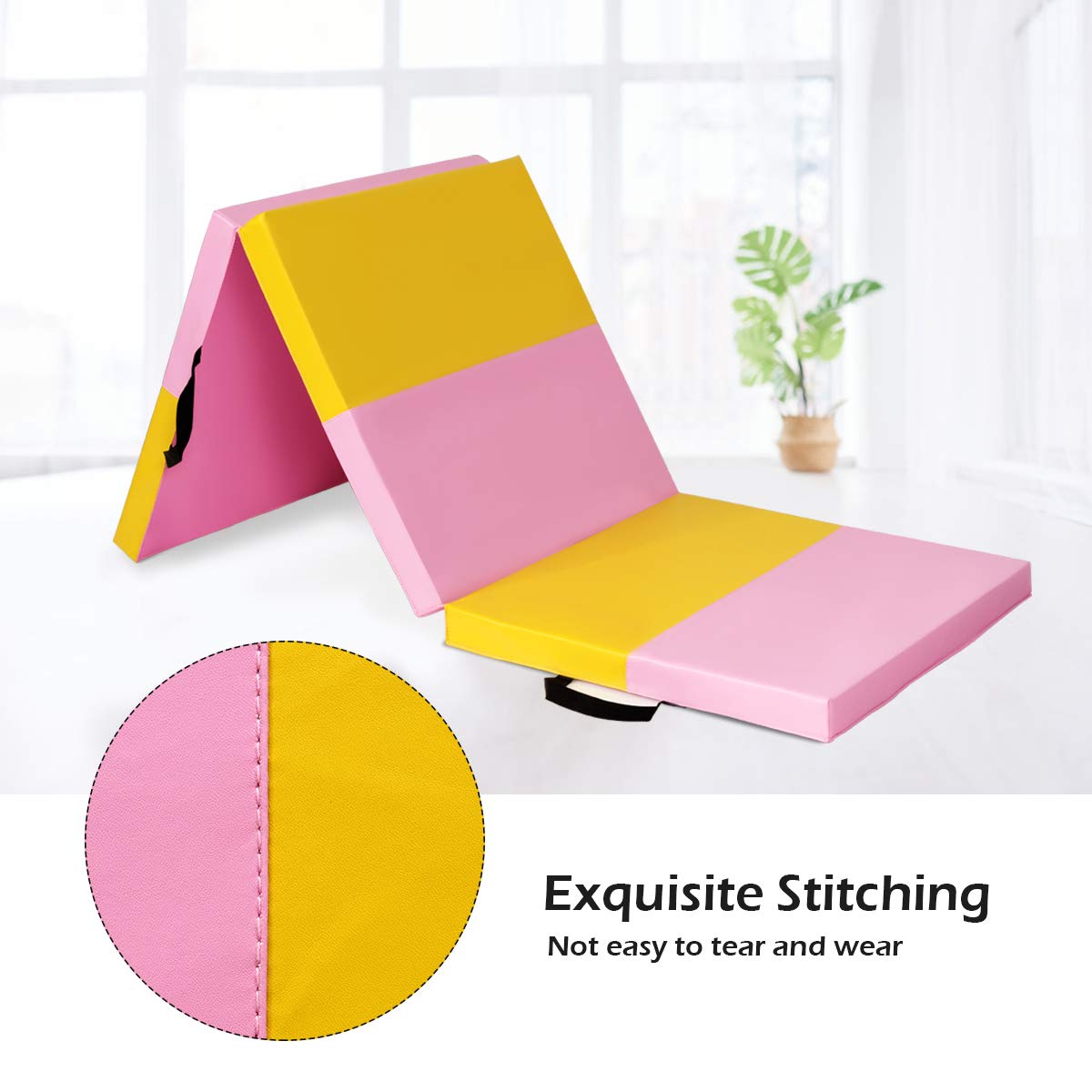 Gymax Tri-fold Exercise Met, Gymnastic Mat Tumbling Fitness Gym Mat with PU Leather & Carry Handles