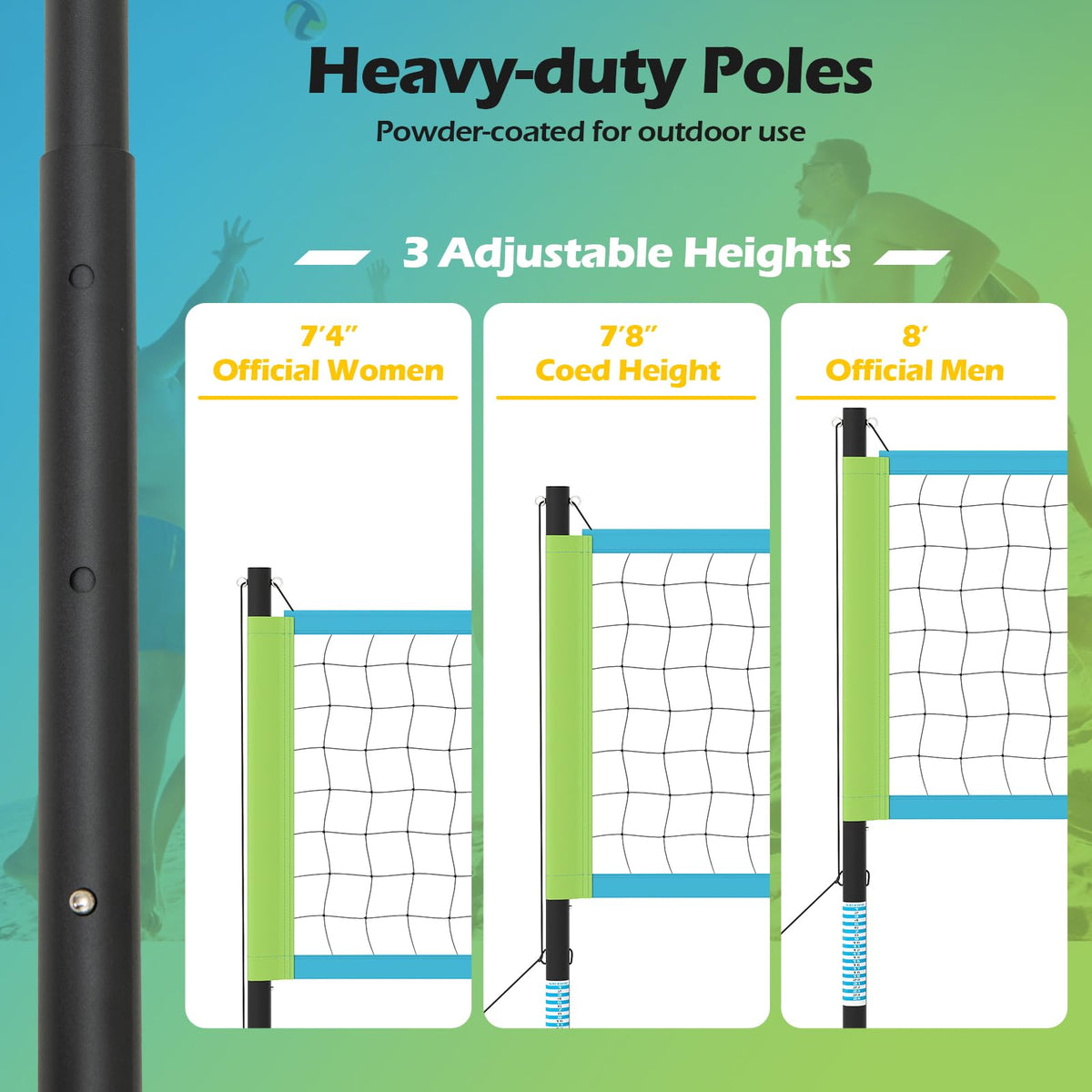3 adjustable official heights for women’s, coed, and men’s volleyball
