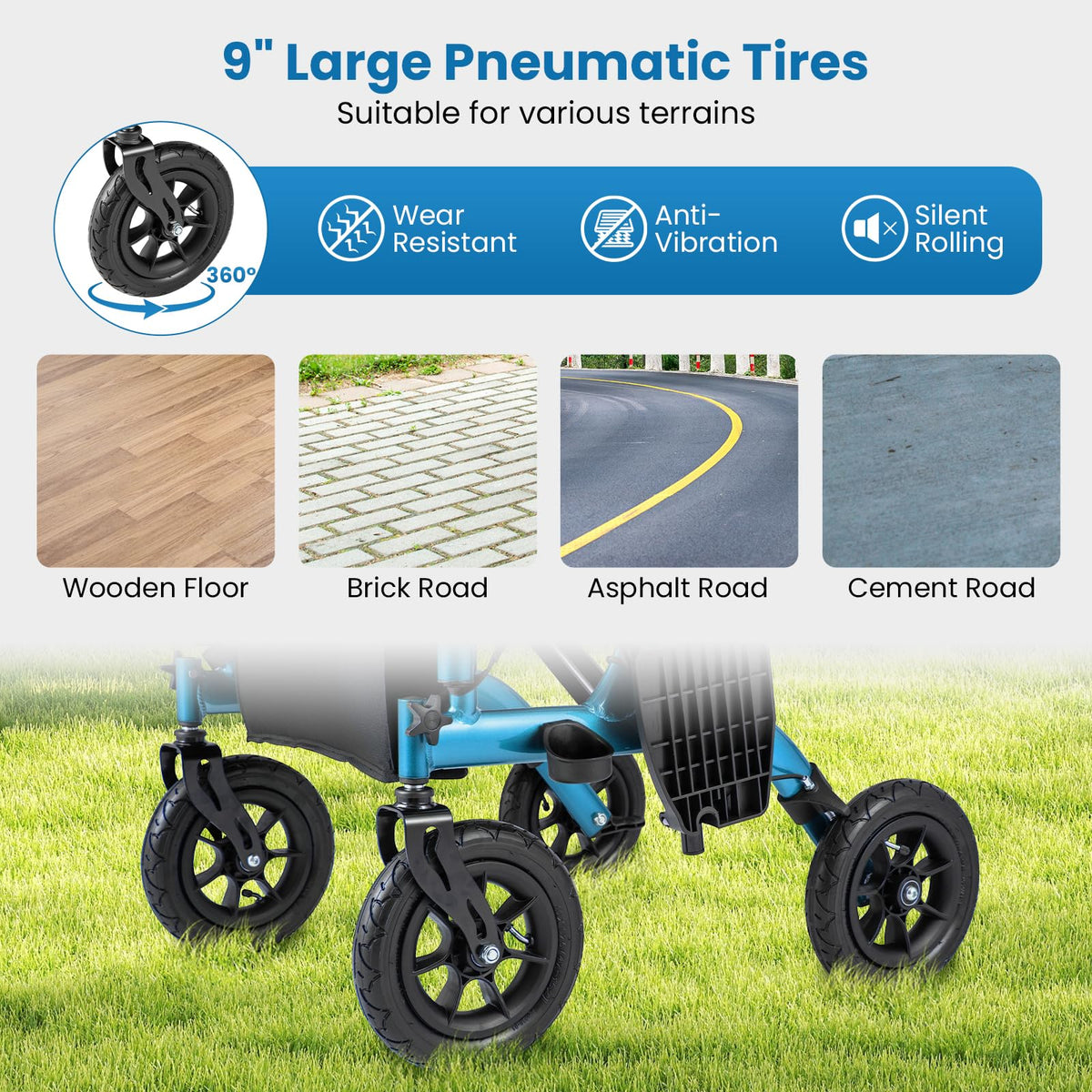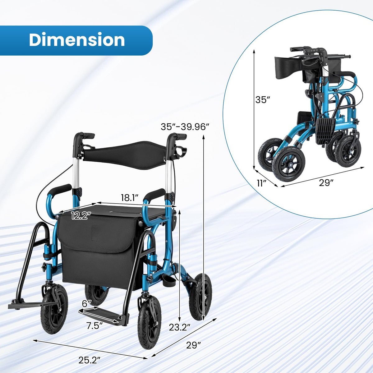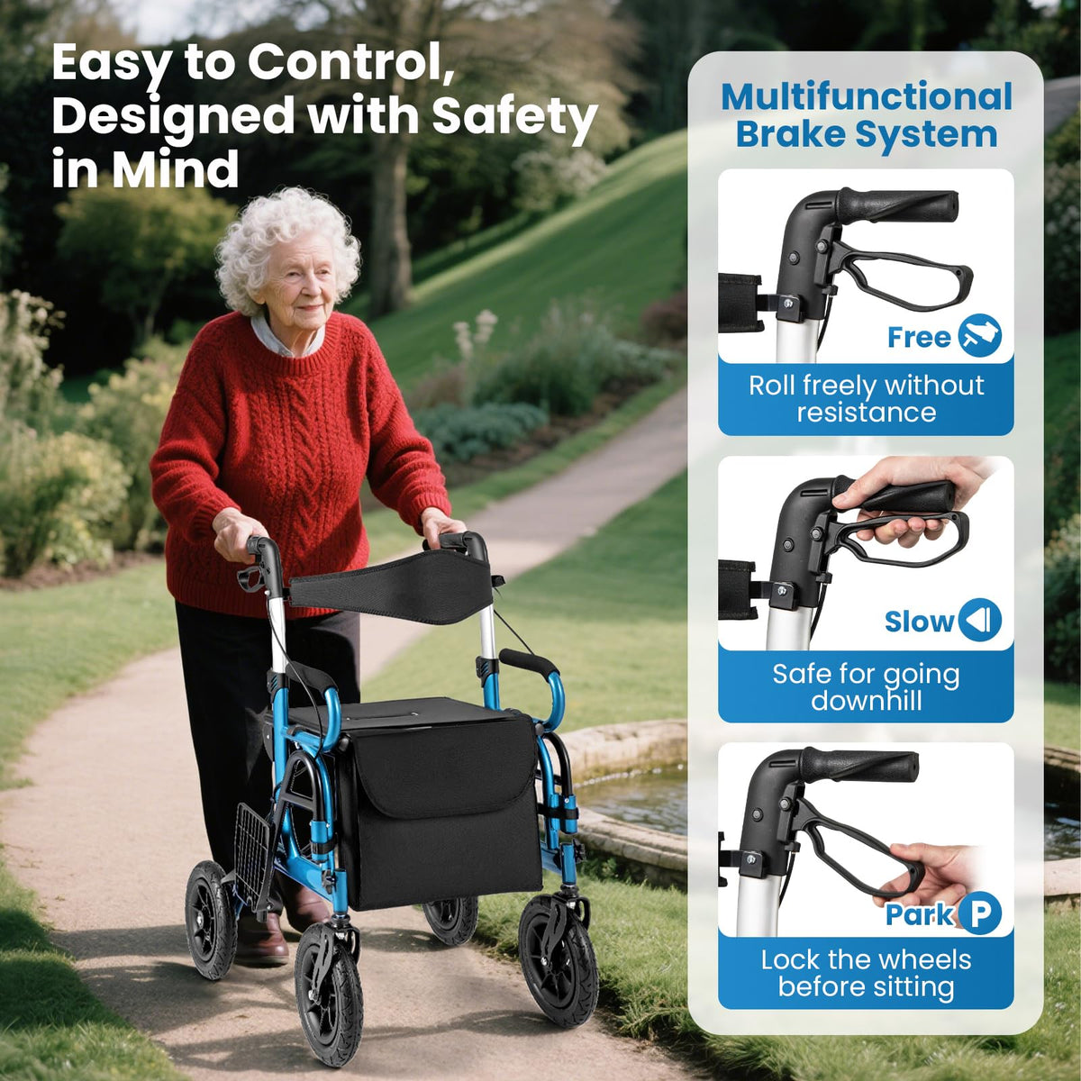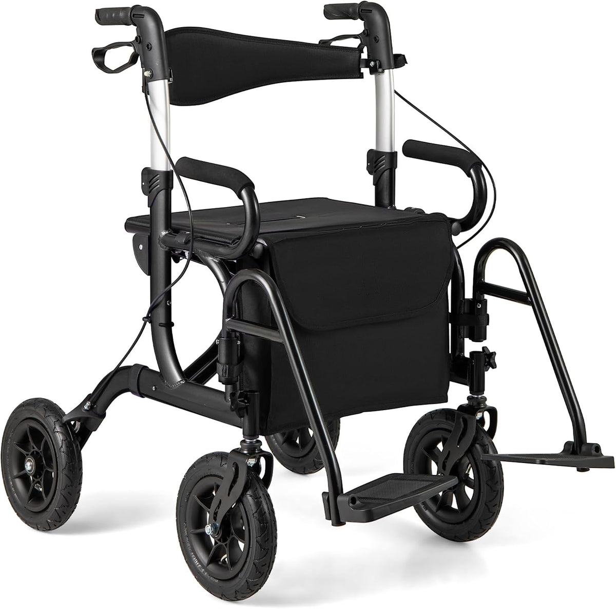Providing 6 adjustable height levels for comfort and ease of use, this rolling walker features all-terrain pneumatic tires for a smooth ride in various indoor and outdoor surfaces. The multifunctional braking system offers enhanced safety and control. Easily foldable for convenient storage, this walker and transport chair combo is the perfect mobility aid for seniors and individuals in need of assistance.
