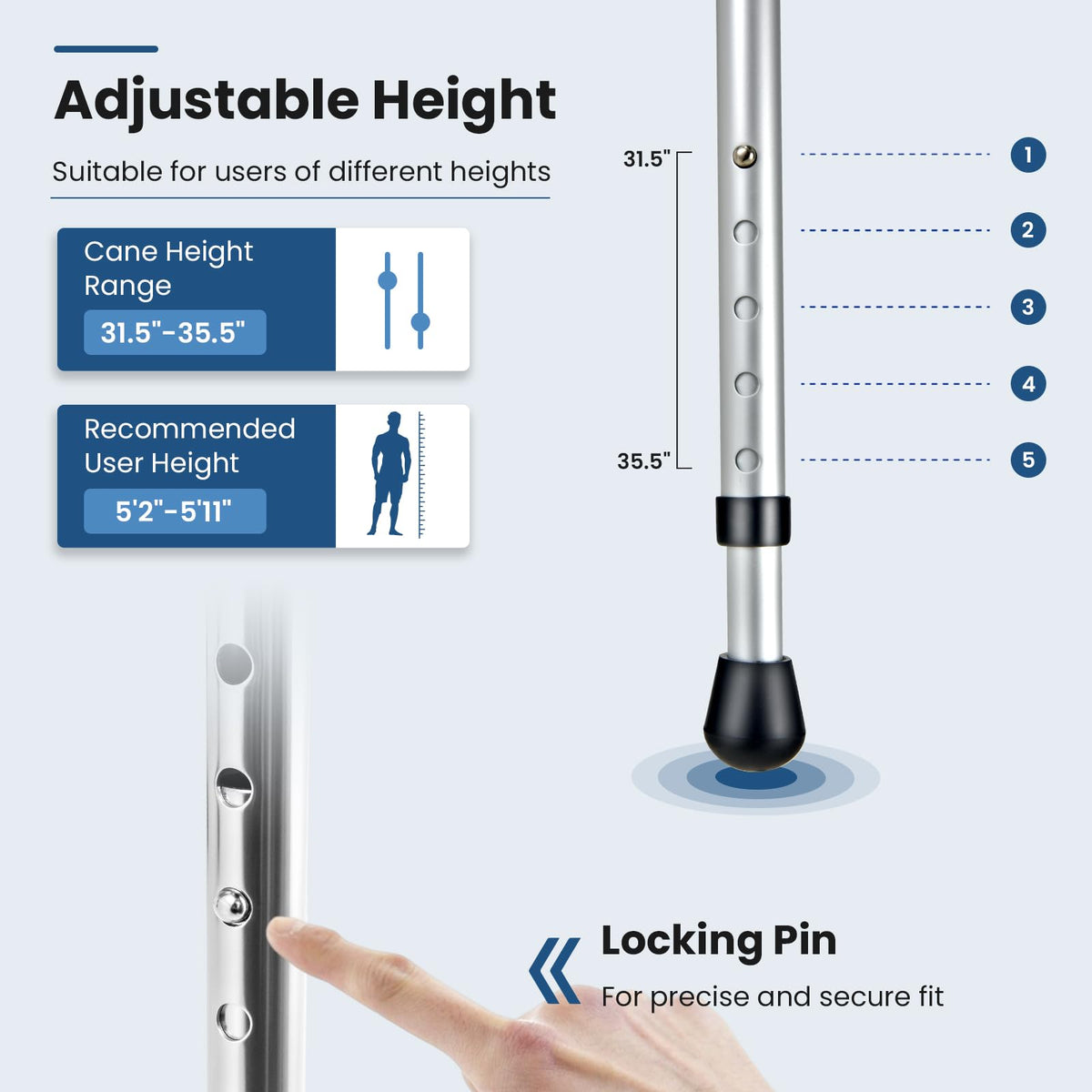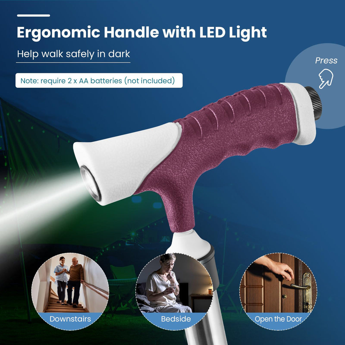 - 5-Level Adjustable: 5-Level adjustable cane is suitable for most height, and allows you walk with your most comfortable posture. Powered by 2 AA batteries (not included), the built-in LED light improve your safety at night.