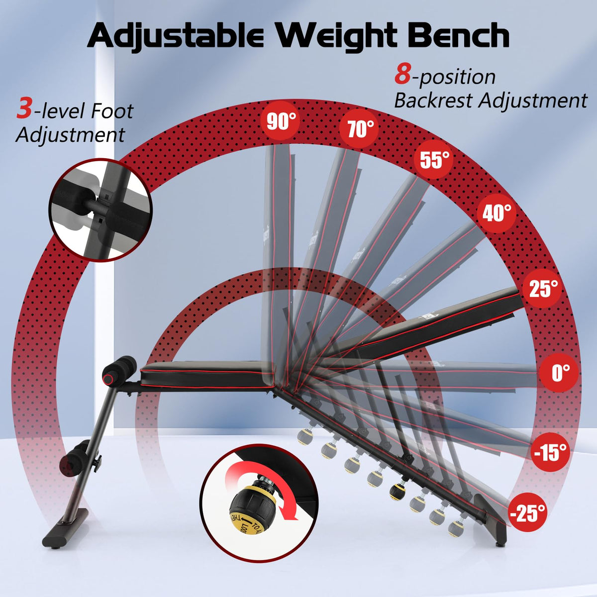 - Adjustable Weight Bench: This strength training bench boasts 8-position backrest adjustment as well as 3-level foot adjustment,offering multiple choices for incline, decline or flat position.