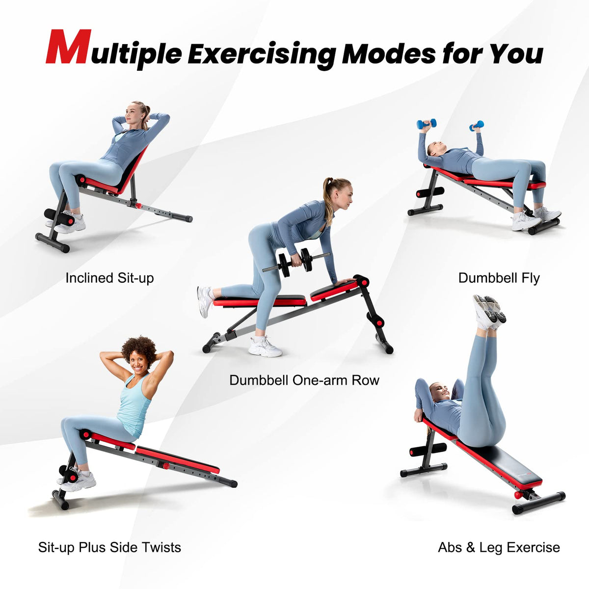 - Adjustable Backrest & Full-body Workout: Featuring 9 different backrest positions, this adjustable weight bench can be adjusted into a declined, flat, or inclined position, which allows you to do a variety of exercises, like sit-ups, dumbbell fly, dumbbell one-arm row, leg raises, etc. And it can train multiple muscle groups - arms, shoulder, abs, back and legs.