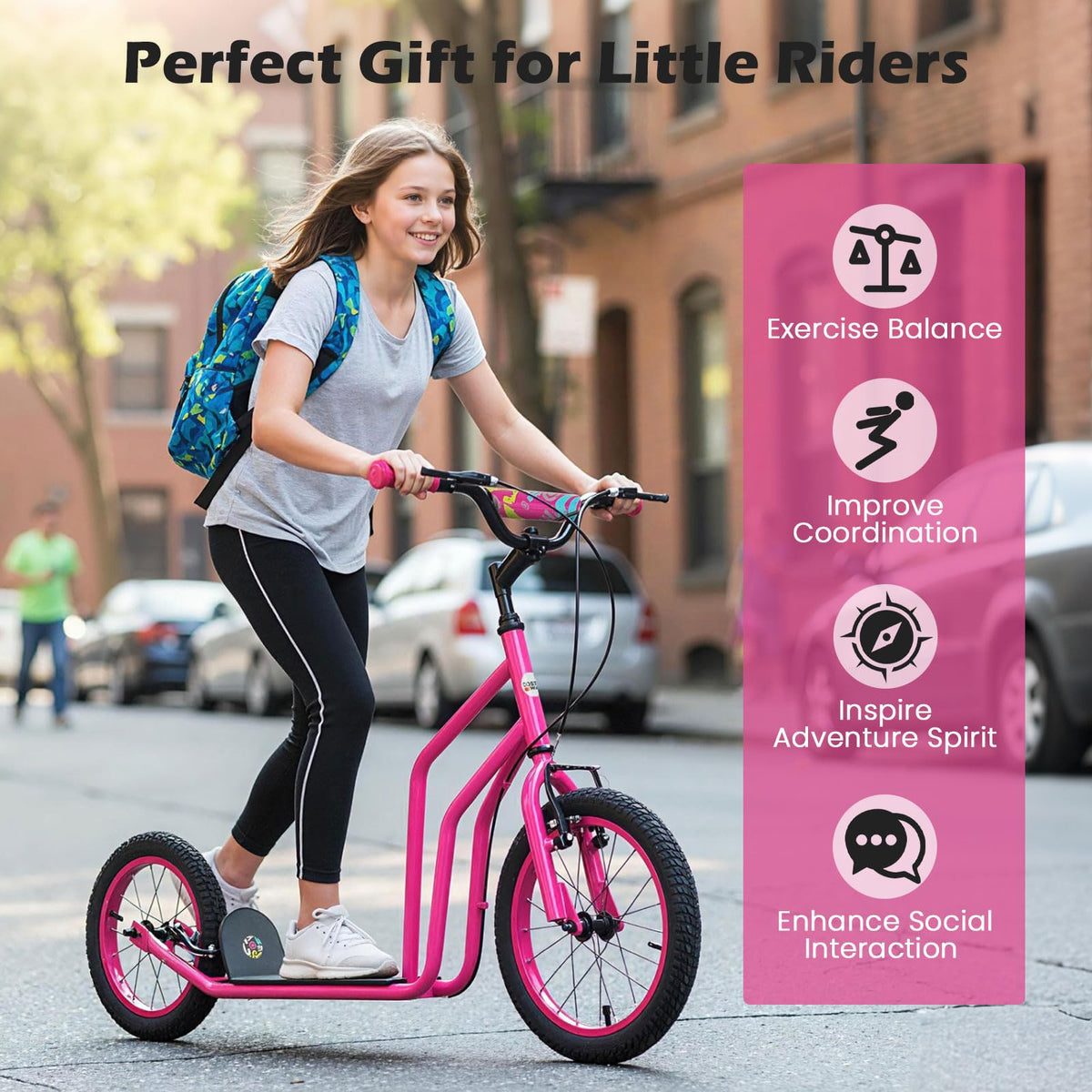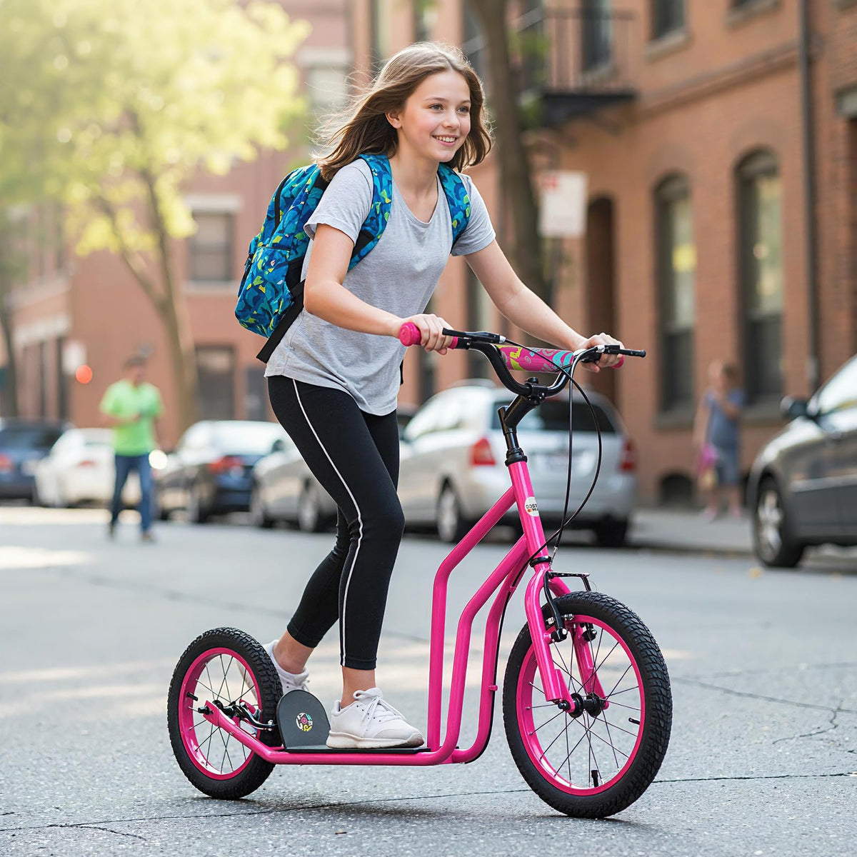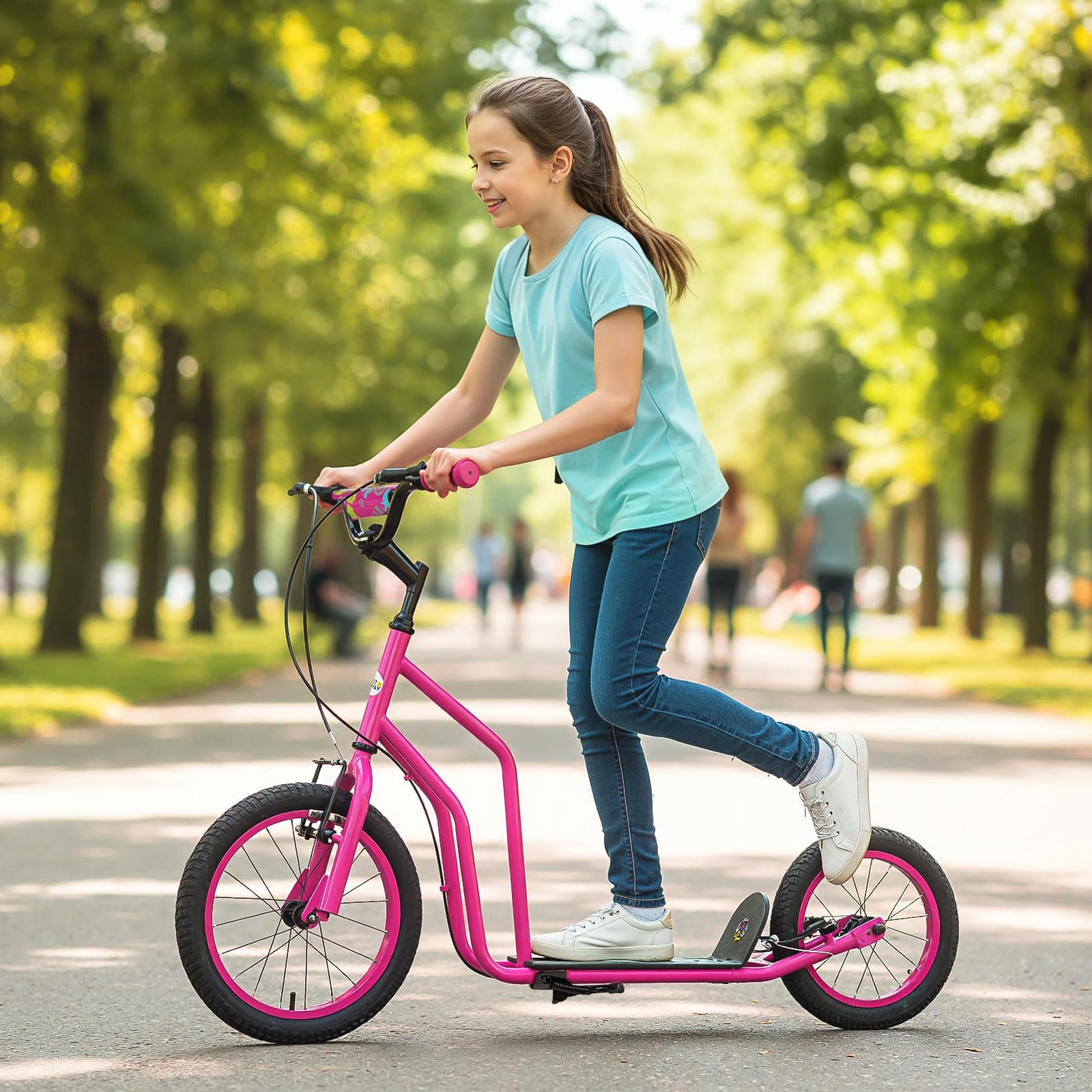 Designed for kids aged 8 years and older, this scooter comes with an adjustable height handlebar to suit growing riders. The large 16” front and 14” rear inflatable wheels help absorb shocks from various surfaces, enhancing the riding experience whether on sidewalks or park paths. Safety and control are emphasized with dual hand brakes, giving riders the ability to slow down or stop efficiently. The wide deck offers ample space for stable footing, supporting balance and ease of maneuvering during rides. Additionally, a convenient kickstand makes parking hassle-free.